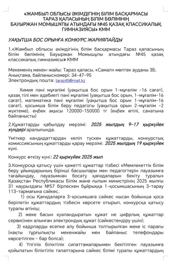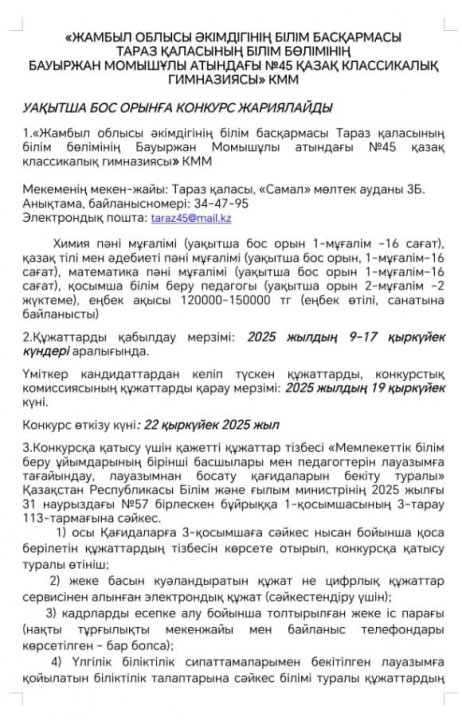 БОС ОРЫНДАРҒА КОНКУРС ЖАРИЯЛАНАДЫ » Гимназия №45
