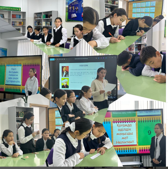 «Әділ болу – адамдық қасиет» 6-сынып оқушыларымен адам бойындағы ең асыл қасиеттердің бірі — әділдік туралы дөңгелек үстел өткізілді. Іс-шараның мақсаты: оқушылардың әділдік туралы түсініктерін кеңейту, әділ болудың адам өміріндегі маңызын ұғындыру және адалдыққа, шыншылдыққа тәрбиелеу болды. Оқушылар әділдікке байланысты жағдаяттарды шешіп, мақал-мәтелдерді жалғастырып, «Әділдік ағашы» шығармашылық тапсырмасын орындады. Іс-шара барысында оқушылар: – әділ болу өзіңнен басталатынын; – шындық пен адалдықтың өмірдің негізі екенін ұғынды.