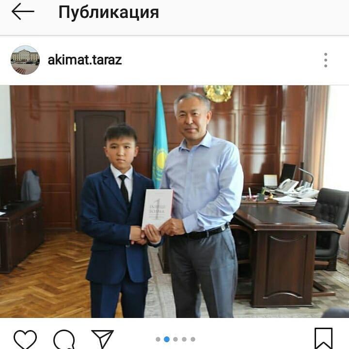 7 "А" сыныбының оқушылары Әмірбек Тоқтар мен Тұрыс Әмір гимназияның дарынды оқушылары ретінде қала әкімімен кездесуде болып, Қ.Шоңбайдың "Екінші болма" кітабын сыйға алды » Гимназия №45