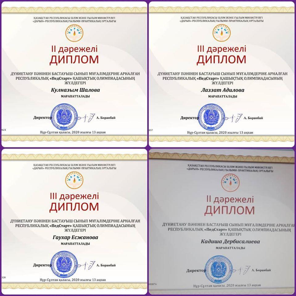 "Дарын" Республикалық ғылыми практикалық орталығының "Дүниетану" пәнінен "Педстарт" қашықтық олимпиадасына бастауыш сынып мұғалімдері қатысып, ІІ және ІІІ дәрежелі Дипломдарды иеленді. Жұматай Раушан, Шалова Кулназым, Беркен Жазира, Адильханова Нурайлым, Бегилдаева Толқын, Есжанова Гаухар, Адилова Ләззат, Киркинбаева Эльвира, Дербисалиева Кадиша, Жанқораз Ардақ, Тилепбергенова Зарина.