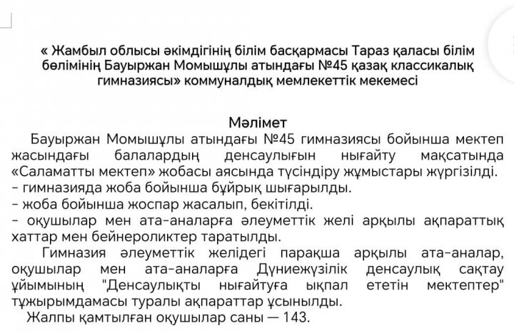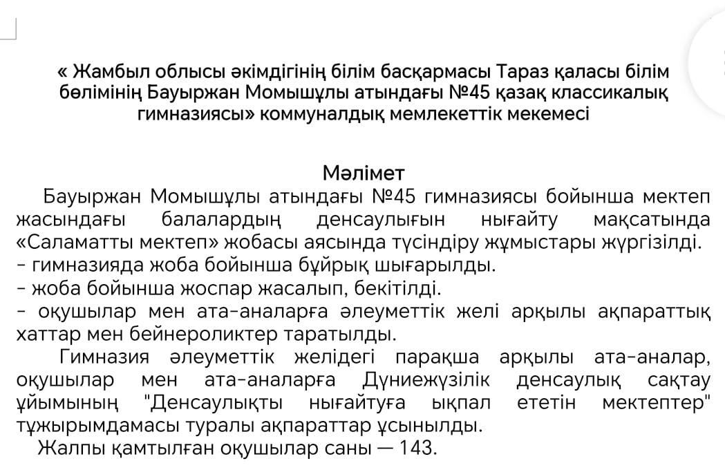 "САЛАМАТТЫ МЕКТЕП" ЖОБАСЫ » Гимназия №45